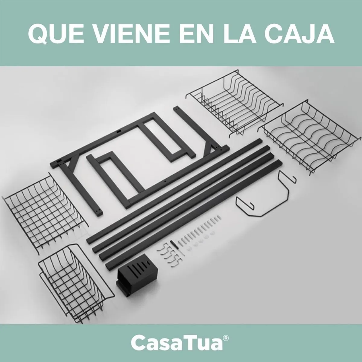 – Cuenta con ranuras para mantener los platos estables, espacio para varios utensilios, soporte para detergente, servicios y tablas.